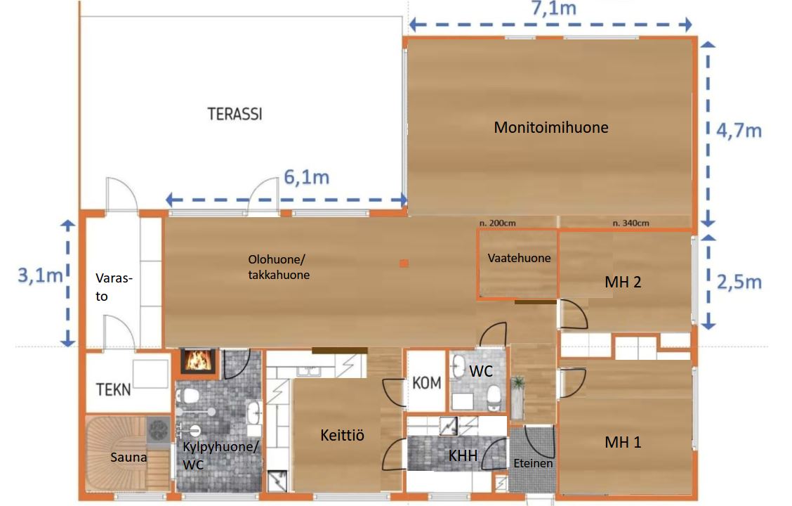 2 mh, iso oleskeluhuone (voi jakaa esim. 2 makuuhuoneeksi), keittiö, olohuone (takka), tuulikaappi/eteinen, khh, kph, sauna, wc, vaatehuone, siivouskomero (ent. kylmiö). Lämmin varasto, kylmä varasto autotallin yht., 2 kylmää ulkovarastoa ja puukatos takapihalla.