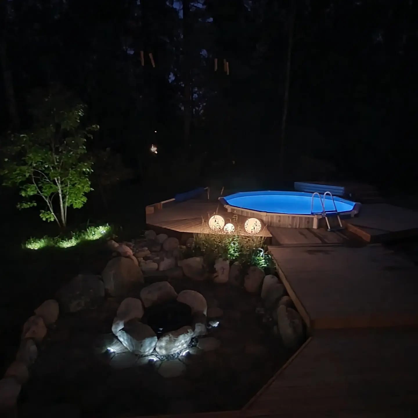 Takapihalla laaja piharemontti, jossa asennettiin salaoja- ja sadevesiputkia kaivoineen, siirrettiin vesien imeytyskaivo talon vierestä takametsään, asennettiin ulkouima-allas lämmityspumppuineen, rakennettiin laaja kestopuinen terassi talon takasivulle ja uima-altaan ympäri, rakennettiin kivetty nuotiopaikka, uusittiin istutuksia, tehtiin pelailunurmikko.
